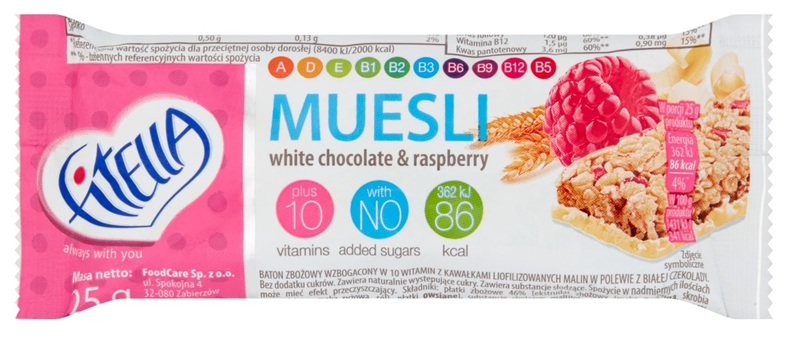 - Fitella Baton zbożowy z kawałkami malin w polewie z białej czekolady 25 g