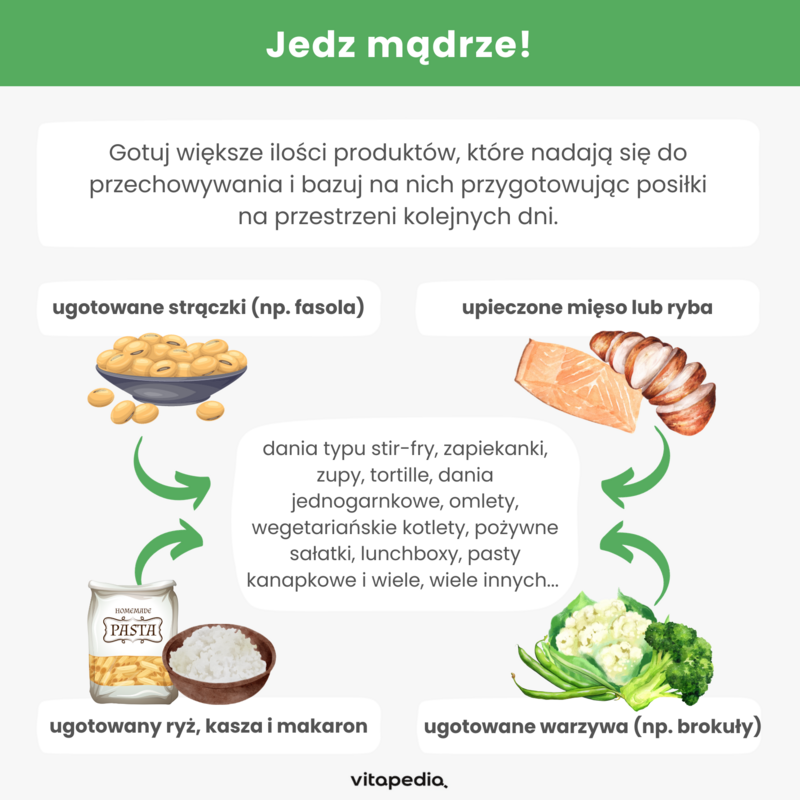 Zadbaj o zaopatrzenie kuchni w wartościowe produkty. Planuj mądrze i świadomie posiłki tak, aby jak najmniej czasu spędzać na gotowaniu i nie marnować żywności. Rób zakupy z listą - rzadko, lecz konkretnie. Nie zmuszaj się do jedzenia konkretnych potraw i produktów, tylko dlatego, że są zdrowe.